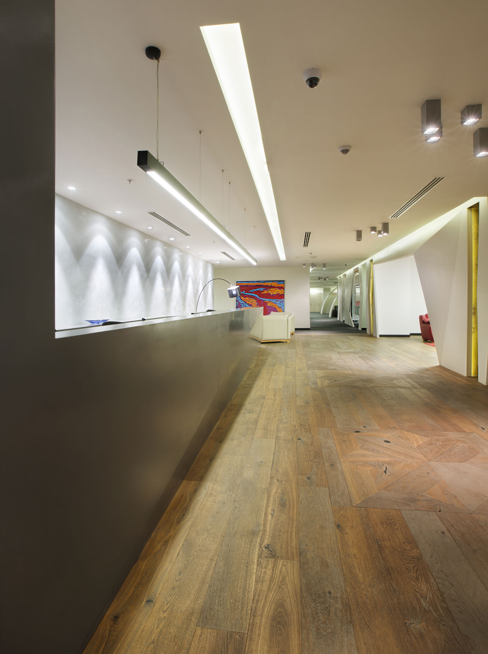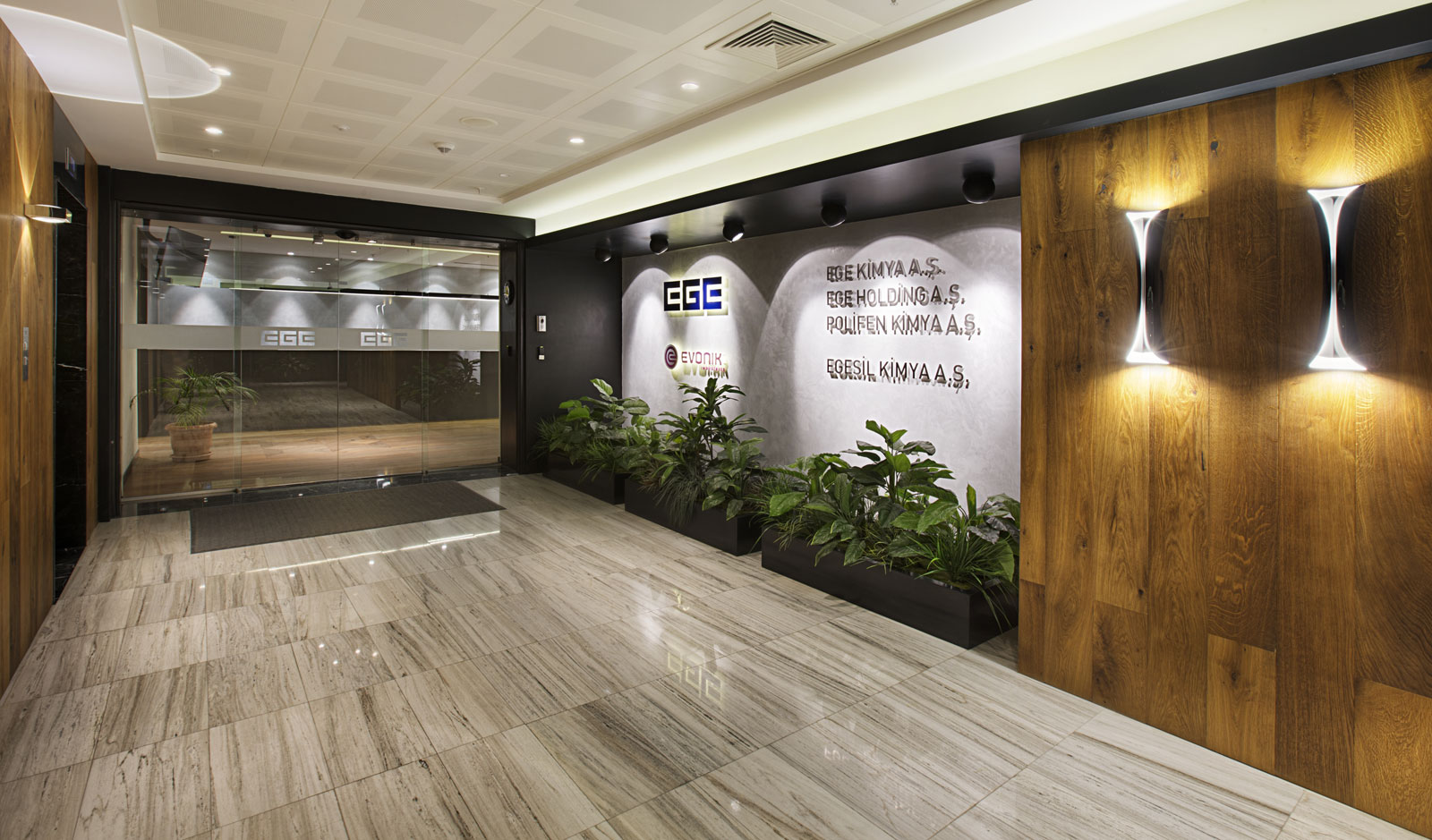 Mimar olarak malzemenin ve çizgilerin sınırlarını zorlamak her zaman heyecan verici bir deneyim. Form çeşitliliği de her fonksiyonun gerektirdikleriyle beraber şekillenmiş oluyor. Corian üreticisi olan Ege Kimya firması için yaptığımız bu projede bizi en çok heyecanlandıran malzemenin form sınırlarını zorlamamıza izin vermesi oldu. Duvar kaplaması, mobilya, banko, bölücü, çerçeve, aydınlatma elemanı, akvaryum olarak kullandık ve gerçekten her form ve fonksiyonda farklı bir deneyim yaşadık. Dört kişinin çalışabileceği “igloo” olarak adlandırdığımız bölücü sisteminde aydınlatmadan masaya kadar her sabit mobilyayı tek malzemeden tasarladık. Böylece malzemenin gücü ile tasarımın gücünü birleştirerek hem keyifli bir çalışma ortamı hem de estetik ve akıcı bir ofis anlayışı yarattığımızı düşünüyoruz. Aynı zamanda kontrast öğeler de olması gerektiğini düşündüğümüzden köşeli ve dairesel formları bir arada kullanmaktan kaçınmadık. Genellikle ofis projeleri yaptığımız için “kurumsal kimlik” olgusu projelerimizde önemli bir yer tutuyor. Bu projemizde de corian malzemesinin kullanımı, dinamik ve yenilikçi formlar, sade ve yumuşak renkler firmanın kimliğini yansıtan öğelerdi.