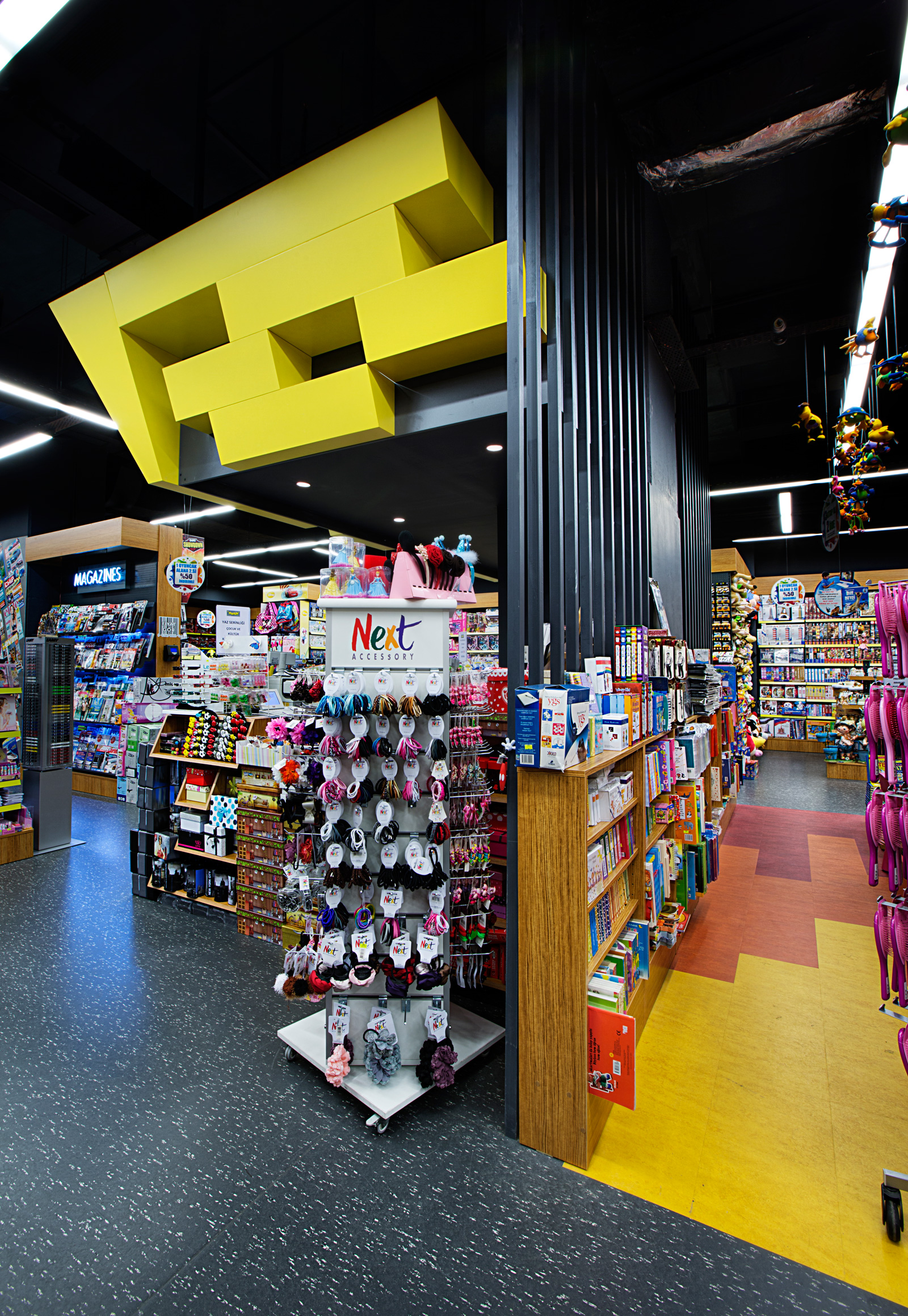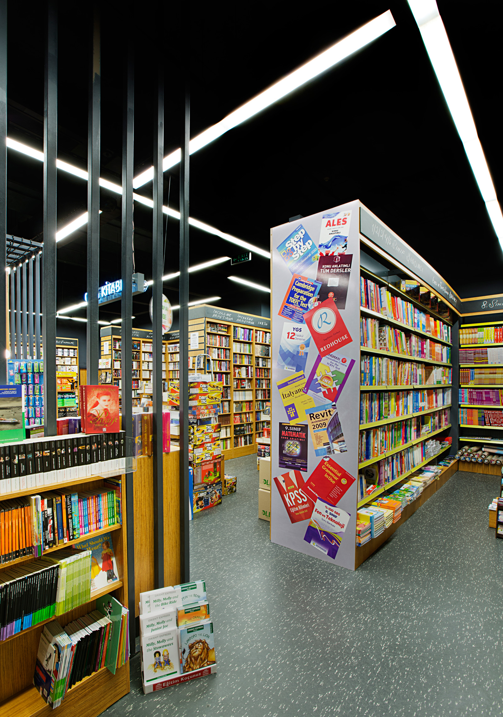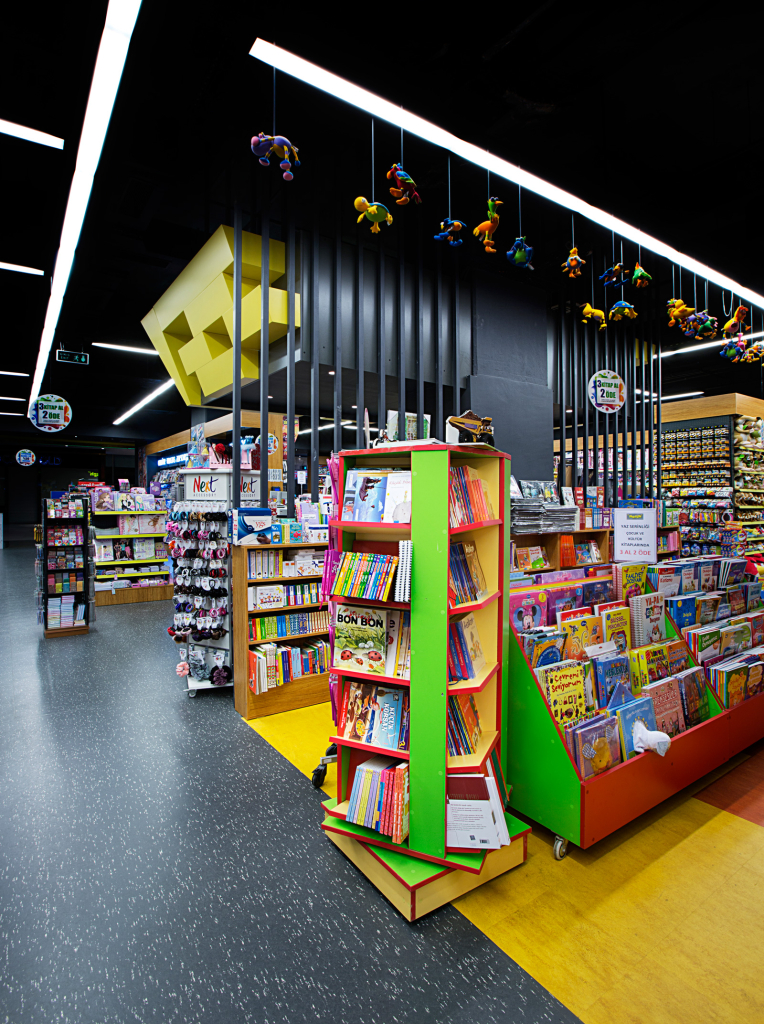 Dekorasyonda sıkça karşımıza çıkan farklı ebatlardaki çelik profiller, kasa bankosu arkasında kullanılarak mağaza derinliğini algılamada yardımcı olmuş, kitap okuma köşesi ve ders kitabı bölümlerinde ise mekan belirleyici ve sınırlandırıcı olarak kullanılmıştır. Mağaza rafları ve düşey panellerde, doğal görünümlü ahşap kullanılmış, genel algıda sıcaklık hissi sağlanmıştır. Zeminlerde yüksek kalite linoleum malzeme kesintisiz olarak kullanılarak, mağaza içindeki net alan algısı arttırılmış, homojen etki sağlanmıştır. Çocuk kitapları zemininde aynı malzemenin 3 farklı rengi karolaj şeklinde uygulanarak çocukların algısına hitap eden eğlenceli bir atmosfer yaratılmıştır.